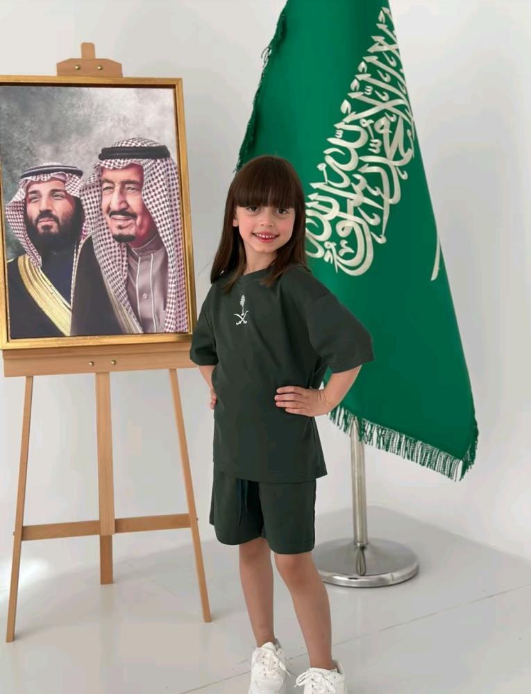 "طقم أنيق ومريح للأطفال، مصمم ليعبّر عن الفخر والانتماء للوطن، مصنوع من قطن أصلي 100%، مناسب للاحتفال باليوم الوطني السعودي."